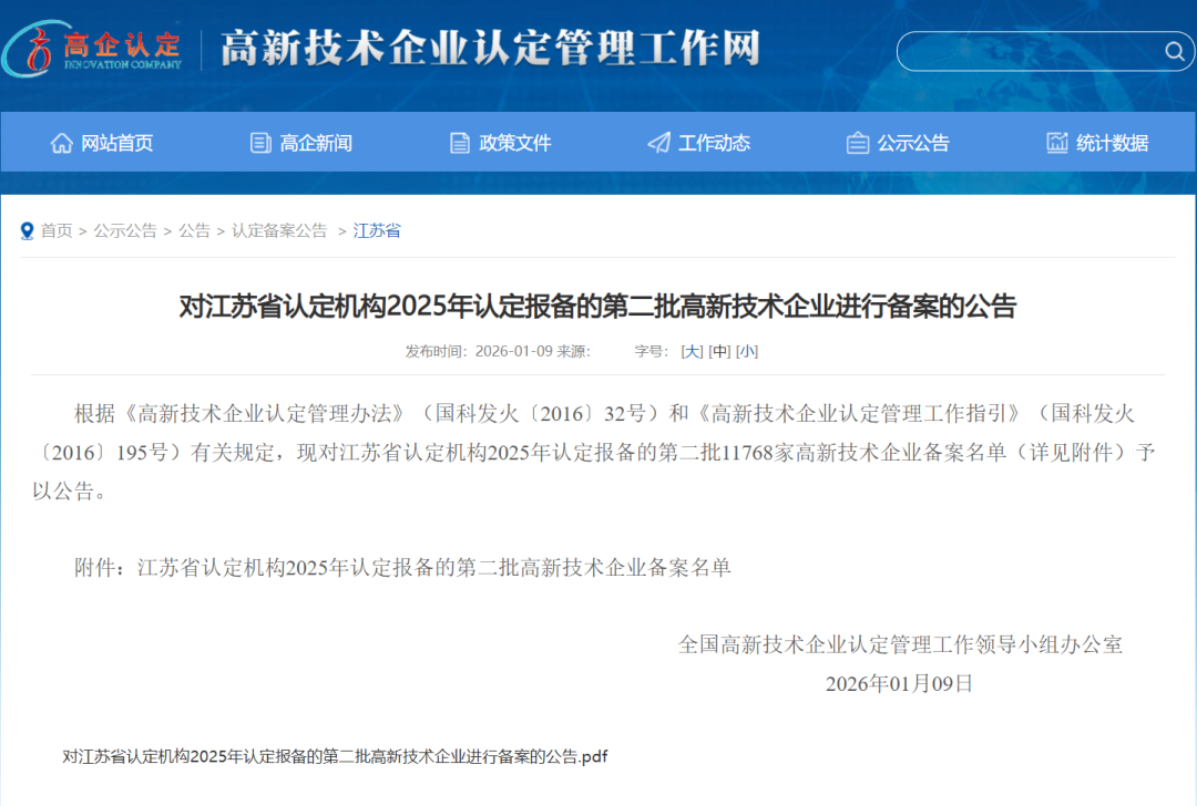 近日,根据《高新技术企业认定管理办法》及相关规定,全国高新技术企业认定管理工作领导小组办公室对江苏省认定机构2025年认定报备的第二批企业进行备案公示。金年会jinnianhui凭借其扎实的科技创新实力与完善的研发管理体系,成功荣列在本次备案中。